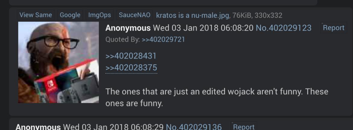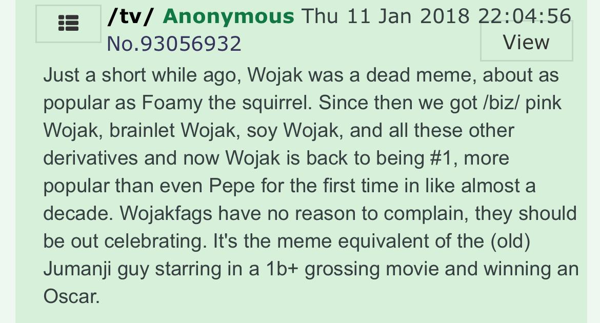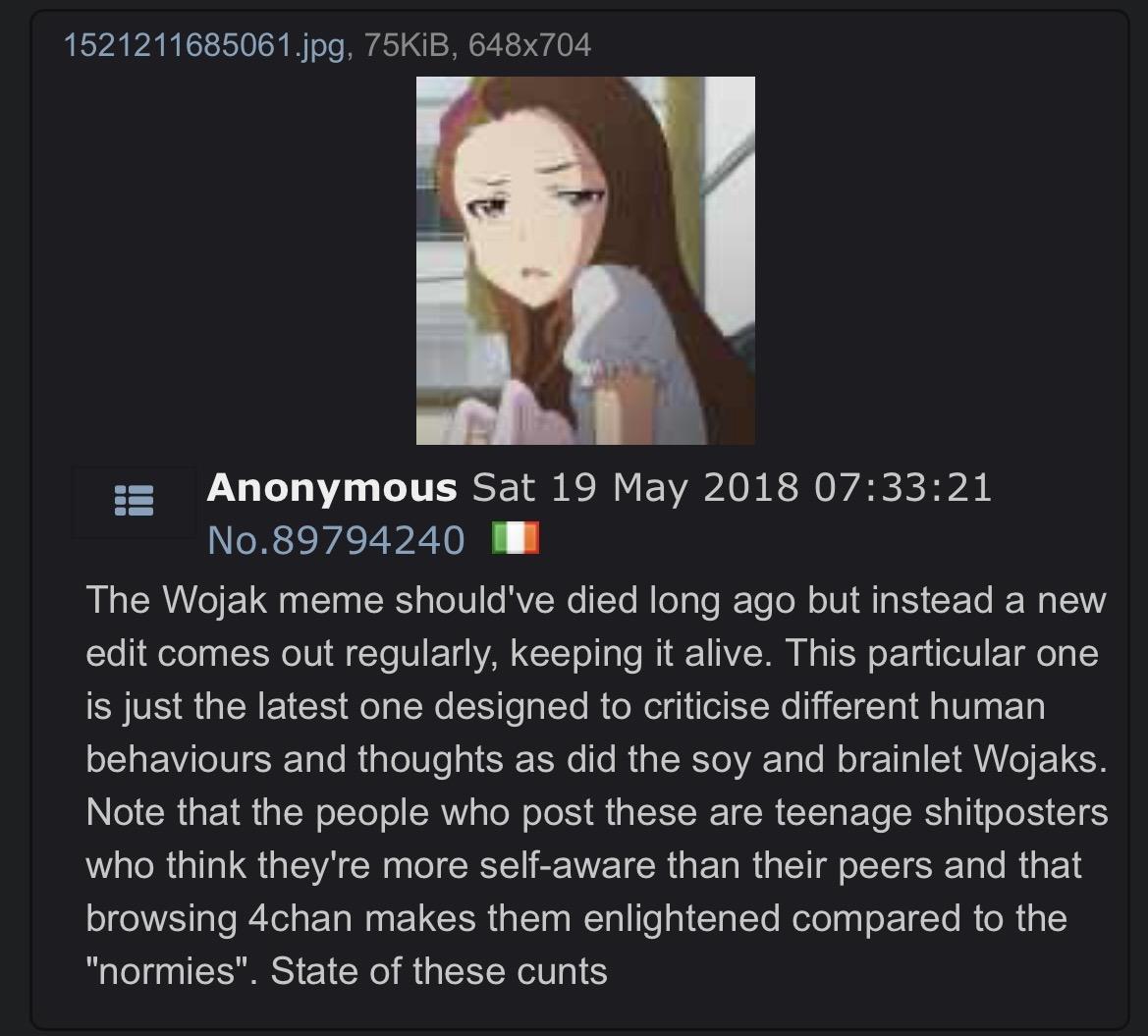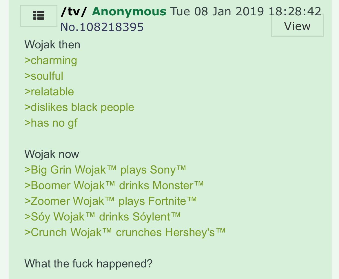 >>15412640Most other wojak variants were for boring self inserts. Soyjaks baited 4cuck users who looked like it (e.g. Nintendo fans) and it kept sparking hilarious seethe. Plus the edits were much funnier + entire variants were made, which cemented its role as a breakaway from wojak