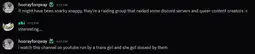 >'blox and 'cord tranny groomer 'p>a dad raping xis toddler>a tranny getting a kid drunk and then raping her>little kids pissing themselves, and pissing on xer self-insert character>jeff the killer rape porn>zoophilia>gore>vore>amputee porn>pedo spiralsbasically fucking every flavour of antimatter