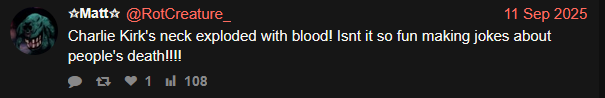 >>15536046 (OP)I keep coming back to how people responded to Charlie Kirk's death with memes and jokes and it genuinely disturbs me. I think there has been an intentional attempt by antihumans to try to kill the reverence in man by declaring humor an unlimited virtue, because one does not revere with a giggle. They are murdering reverence for the man as they murdered the man himself. It's deeply evil. It's a deliberate erosion of the capacity to treat human life as sacred. The joke IS the point for the leftist ghouls. That's what makes it so dark.