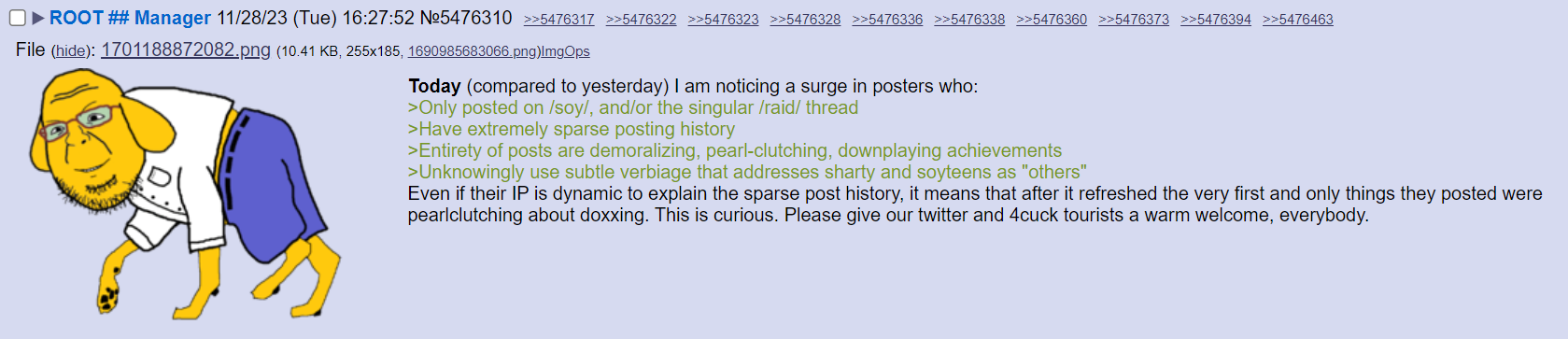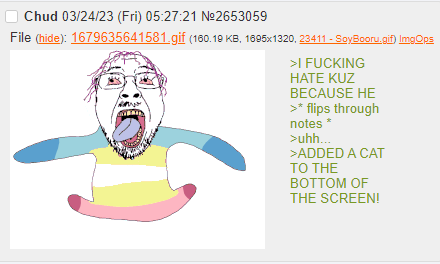 >>15545919this was notable back then but now like 70% of the site's entire post history is comprised of derailing raid threads, spamming HTSM, and posting bait geg