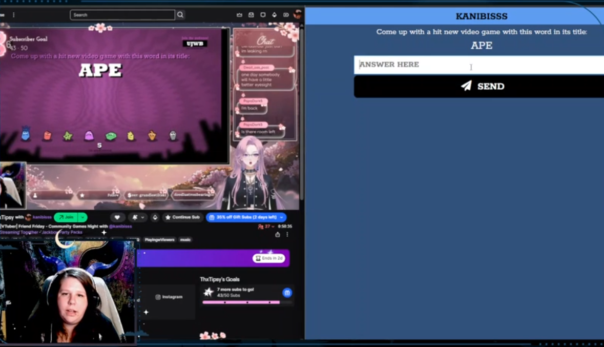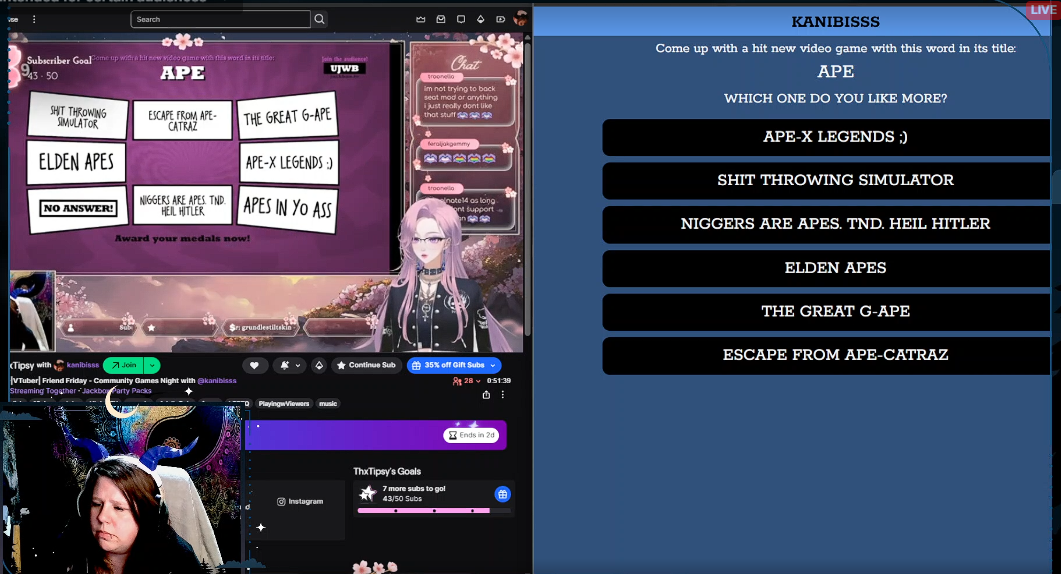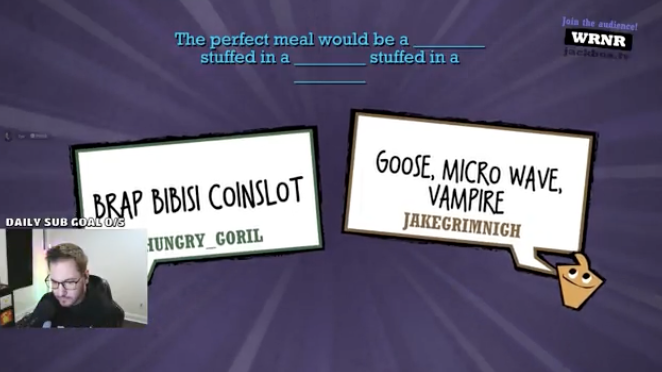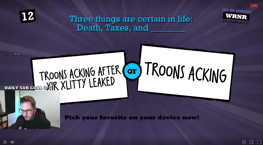 gonna watch tushiebean's stream, let me know if there's any gems in the final quiplash round