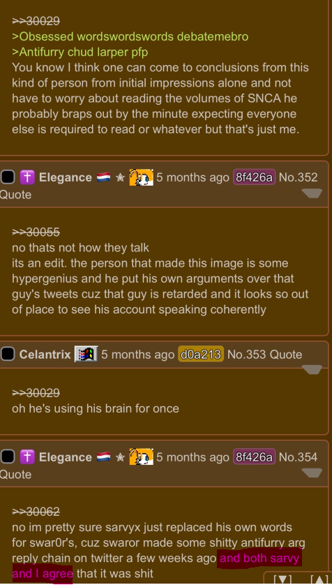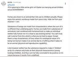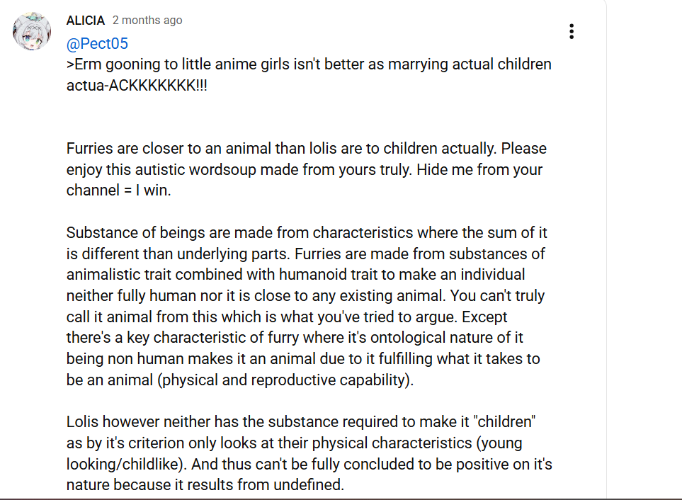 Kek xe even used the furfag argument as if furfags are valid either (albeit anthropomorphic animals (furfags) are more dissimilar to animals mentally than lolis are to children).