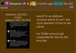 >>15694658arent they similar, the averi one is handled by the soygoy guy who if i remember right tried to leak the ips of a bunch of sharty users and got permanished from the website, the other one is handled by some ukropig who also got permabanned from this website for i dont remember what reason and allegedly was in some cord