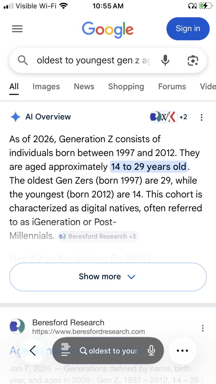 >>15743450 (OP)Also Gen Z is only 14 to 29 right now. So that’s 15 different ages, pretty sure most don’t get it until they’re 18.