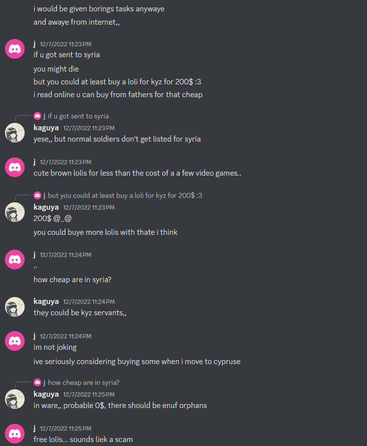 >>15758517That's Kuz and Kaguya talking about buying "lolis" (albeit here they're talking about actual children or adults dressed up as children)