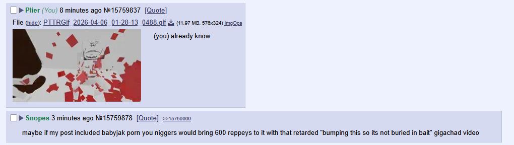 maybe if my post included babyjak porn you niggers would bring 600 reppeys to it with that retarded "bumping this so its not buried in bait" gigachad video