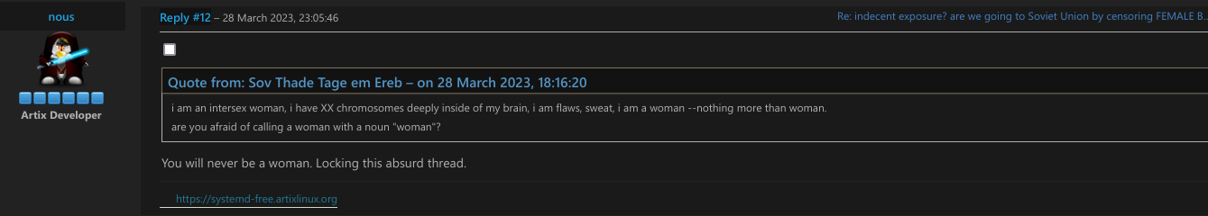 artix or arch, I don't know much about the creators of both but I know that arch is the most validating distro for trans xisters