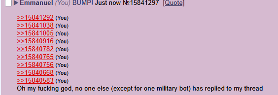 Oh my fucking god, no one else (except for one military bot) has replied to my thread