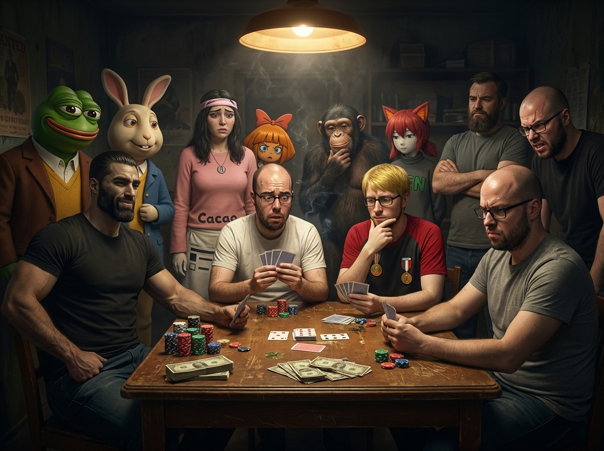 They’re spectators, not players. Pepe the Frog and the rabbit both look amused/smug, the woman with the headband looks concerned, the monkey looks thoughtful, and the guy on the far right looks pissed off — but none of that changes the four actual players’ body language.