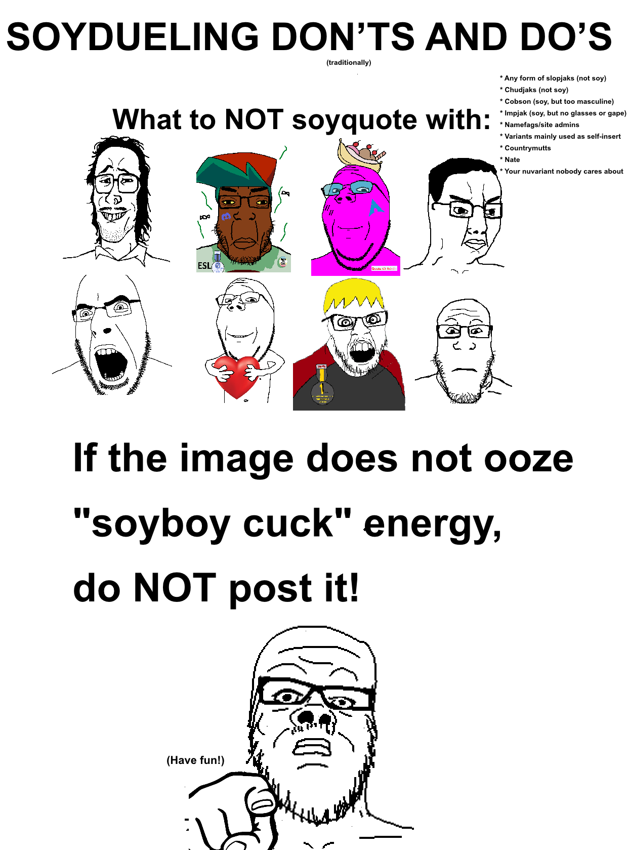>>>>>>>>>>Can someone make a friendly graphic to teach newduelers how to soyduel the traditional way? I’m tired of seeing slopjaks and namefags being used