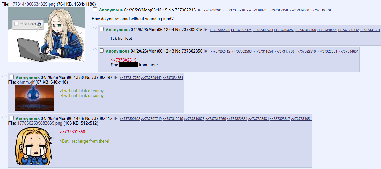 >>15923019I'm quick to anger. Especially when it comes to massive perverts, which are usually the people who question me on anything sexual because they always think they have a "gotcha" that excuses them.