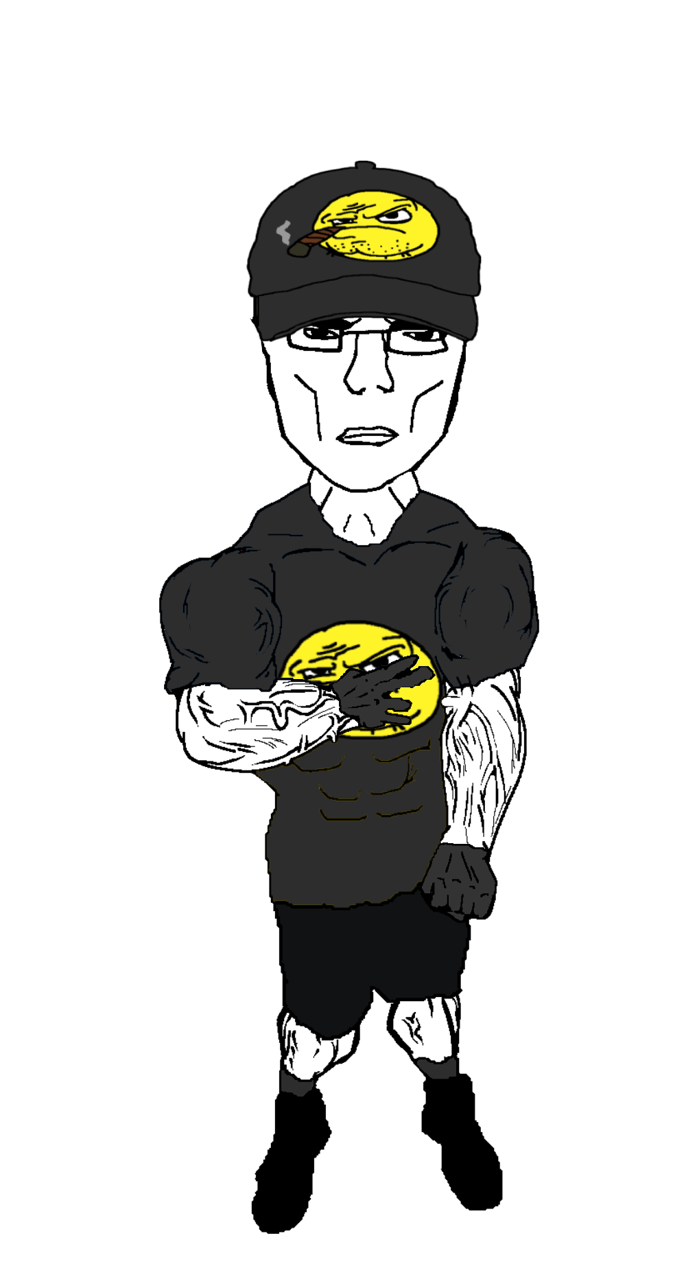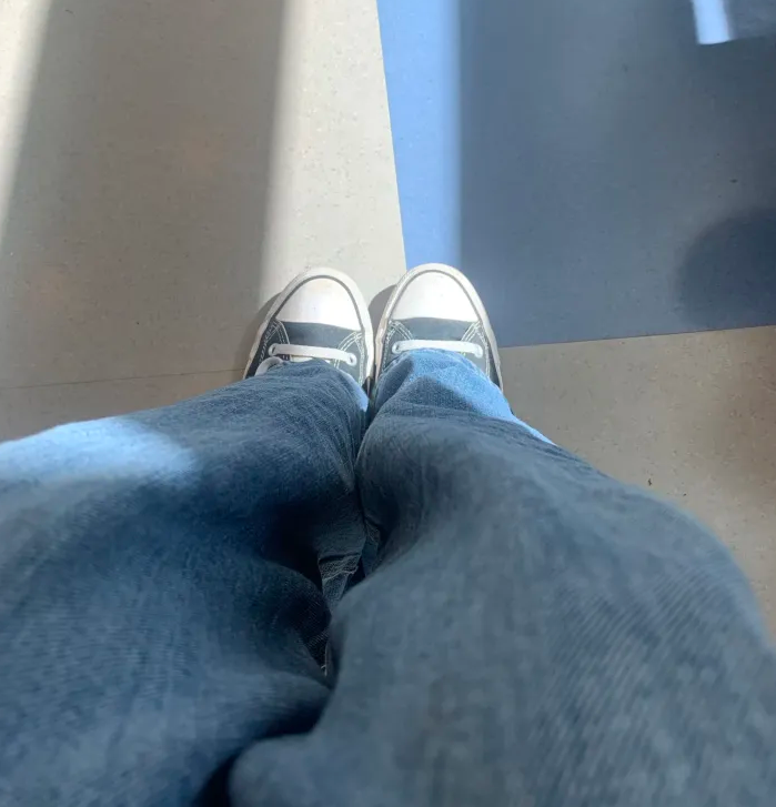 black t shirt and green baggy pants and I tuck my shirt into my underwear so my waist looks thinner and dirty sneakers