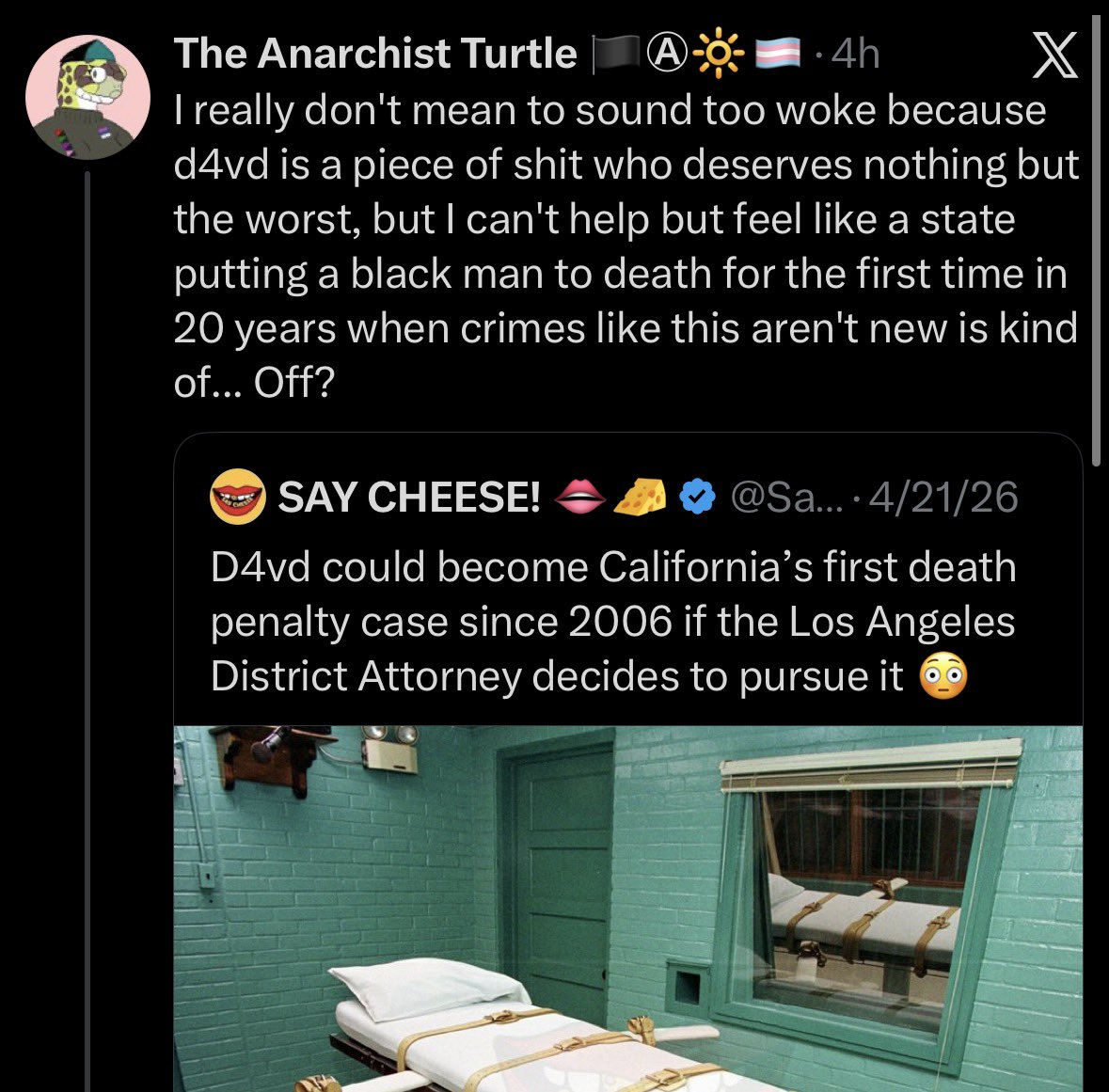 He is a annoying xitter faggot who celebrated kirks assassination (and is very obessed with him) and defends a black jartycuck pedophile rapist murderer from being executed
