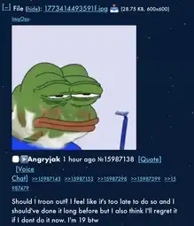 >>16014314heis self inserting as it. he wishes he was a 16 year old girl killing himself. most trannys think like this