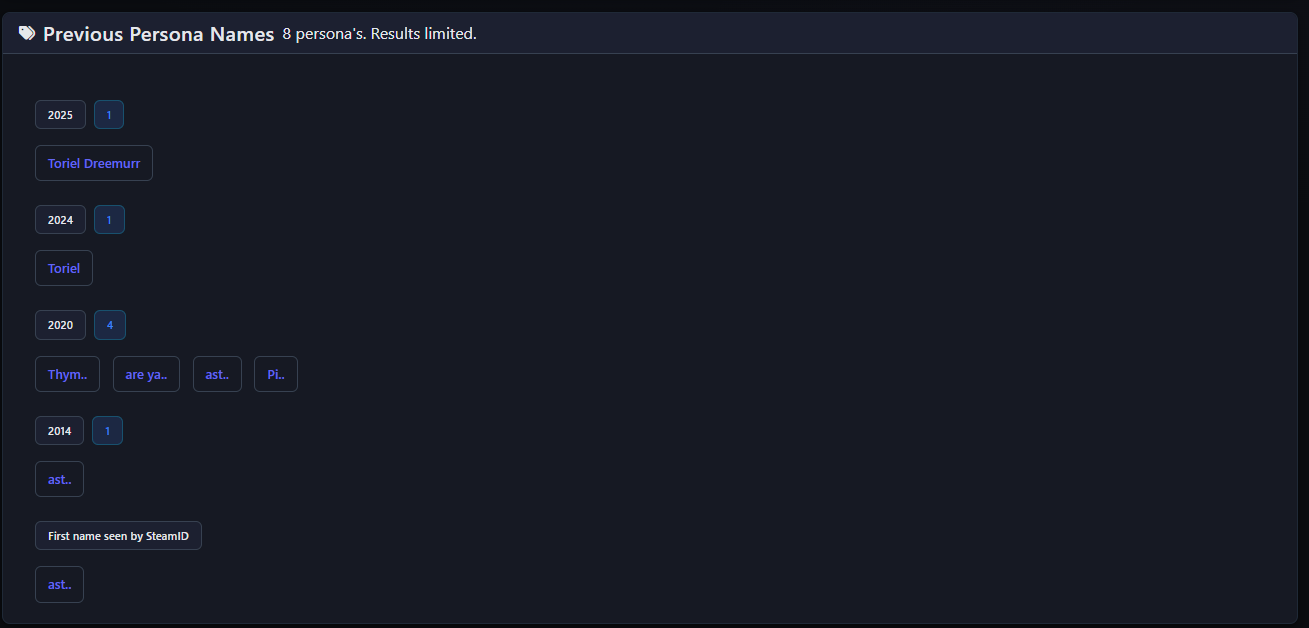 >>16016839enter his steamid and search, it'll show all of his old usernames, also try his vanityurl (torielstarstorm) too