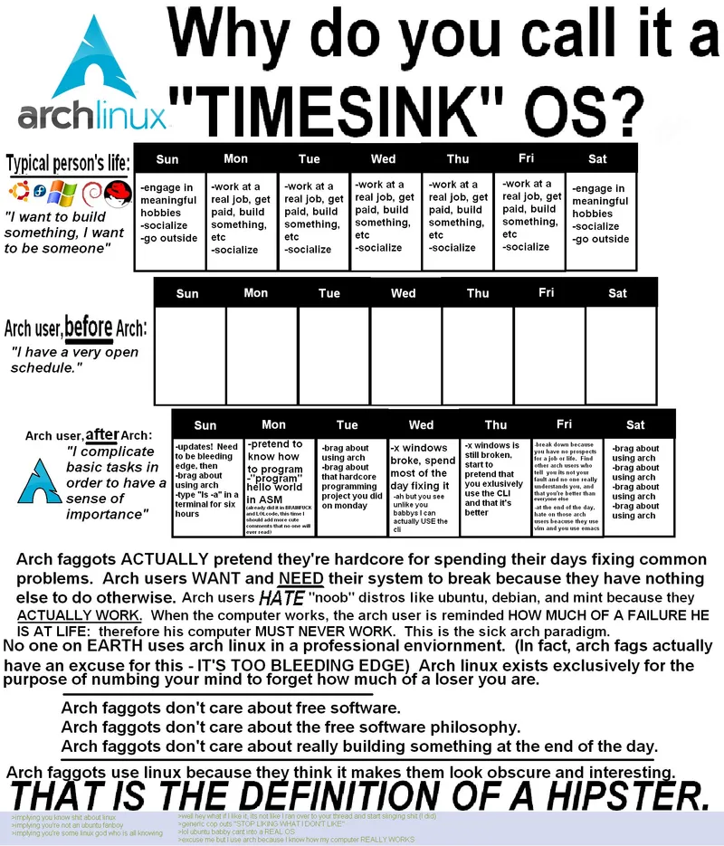 >>22621That was back when it's actually hipster to use Arch. Now Arch is mainstream and it isn't "cool" and "hipster" anymore. Only retarded redditors think using Arch makes you look cool. It's also used by Valve as a base for SteamOS and it doesn't break that much anymore