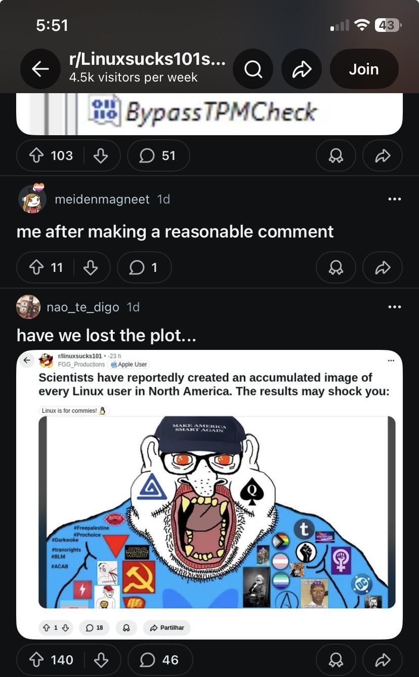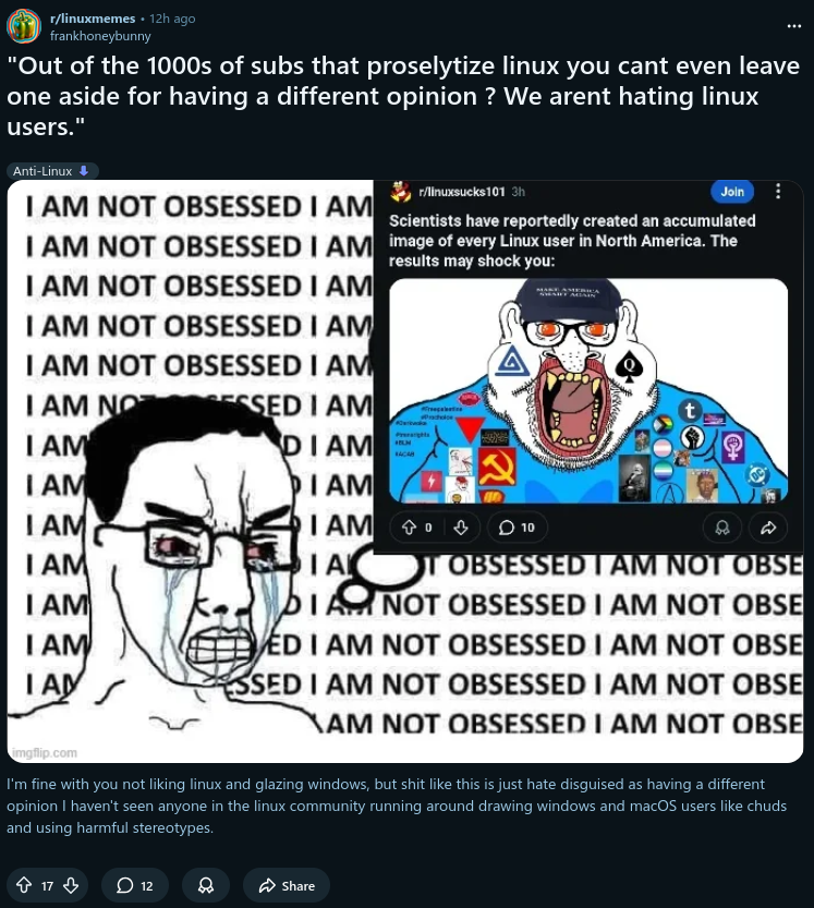 >I haven't seen anyone in the linux community running around drawing windows and macOS users like chuds