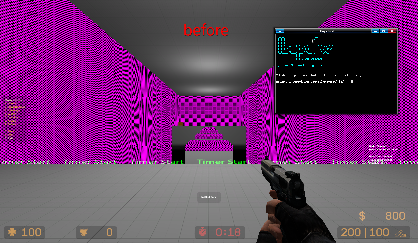 use this to fix missing custom textureshttps://github.com/scorpius2k1/linux-bsp-casefolding-workaroundRETARD, LISTEN, THIS MAY NOT WORK WITH SOME SERVERS WITH sv_pure ENABLED, so back up your cstrike/maps/ folder, btw i've never done this myself and it has worked with every server i've usedthis has to be used every time you download a bsp, the missing textures has to do with capitalization of files on native linux builds.why has this not been fixed?