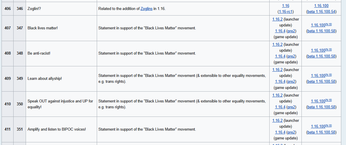 >>54270Seeing the minecraft live announcement, watch whatever they reveal be some shitty cuteslop mob that will be able to be pet once every 10 minutes to get a new "fluffy fur" item that needs to be crafted 2x2 to be made into a block, and looks like wool but a tiny bit different. This will be the only thing thats a part of this """"""drop"""""" since we don't do big updates anymore because the indians at microsoft can't code bugrock edition.