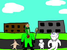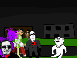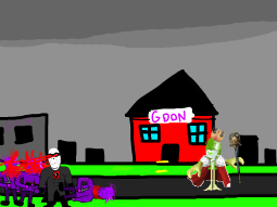 >>89196>>89197Despite his cries, you move on from the swede. After walking for a few hundred meters you come across a group of gooners, they have put up goon gang propaganda on the buildings.